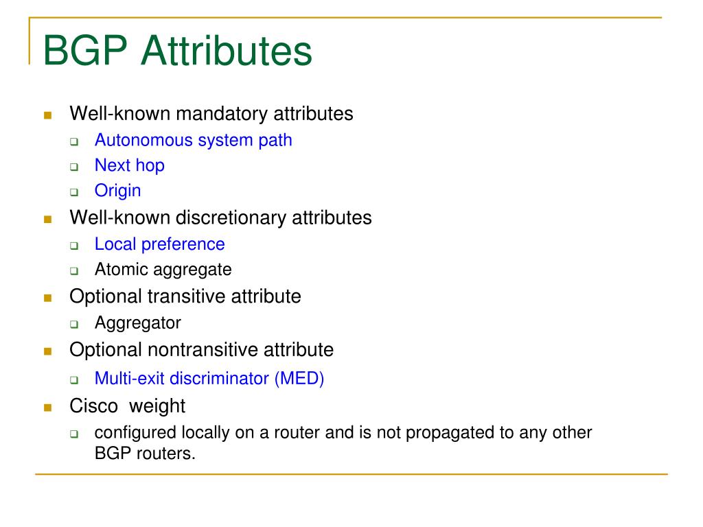 It must be recognized by all bgp implementations and but it doesn't have to exist in all bgp updates. It must be recognized by all bgp implementations and but it doesn't have to exist in all bgp updates.. It must be recognized by all bgp implementations and but it doesn't have to exist in all bgp updates.