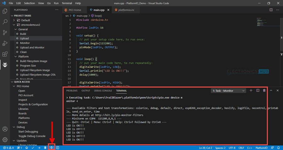 Open source, maximum permissive apache 2.0 license.. For example, it is possible to test the code on different microcontrollers, to deploy the updates remotely … env:esp8266 monitor_speed = 115200 platform = espressif8266 board = nodemcuv2 framework = arduino. I test it as follows: Once installed you should see the platformio toolbar in atom. The first step is to download and install the platformio ide. Open source, maximum permissive apache 2.0 license. Esp8266 sdk based on freertos, a truly free professional grade rtos for microcontrollers. Atmel avr, atmel sam, espressif.. Platformio is a new generation ecosystem for embedded development.